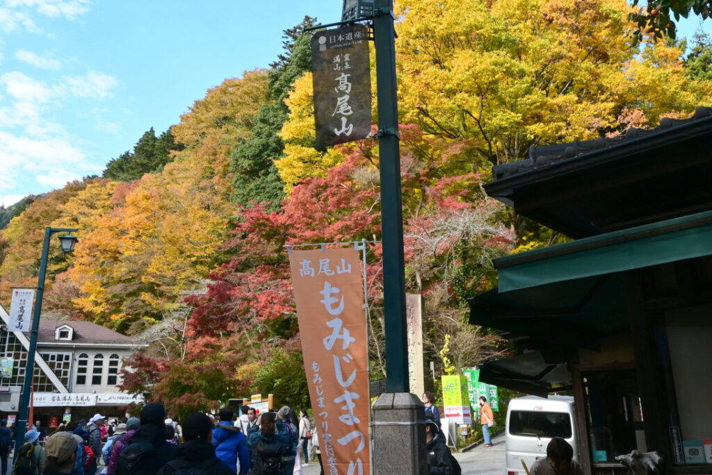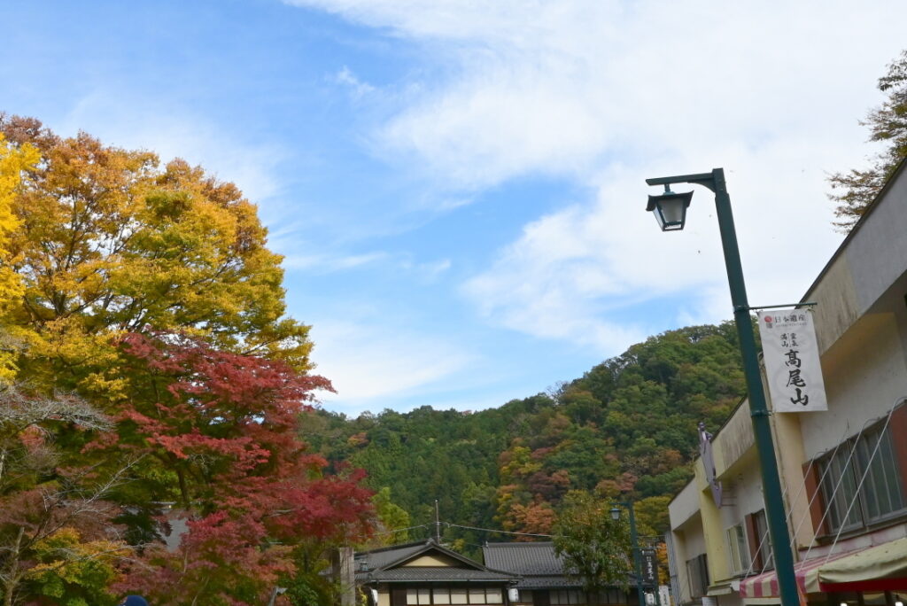 駅を出ると山頂の曇り空が嘘みたいな天気です。紅葉と青空の対比はこの日一番でした。山は下りると晴れるとは高尾山でも同じか....