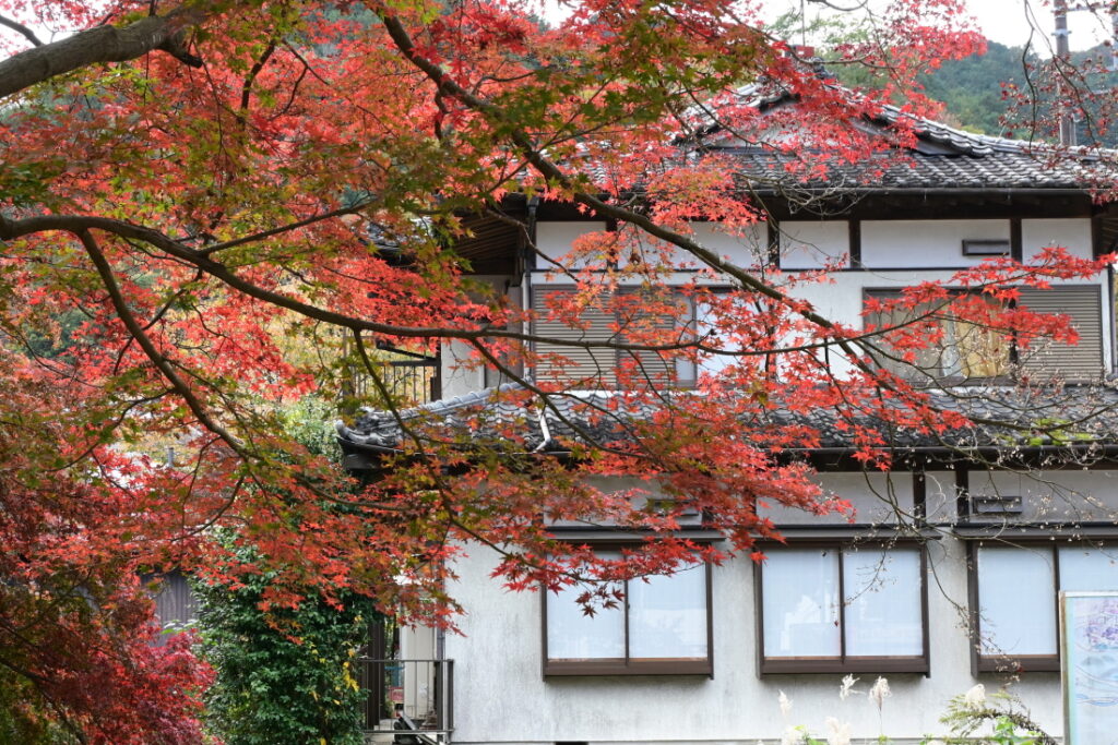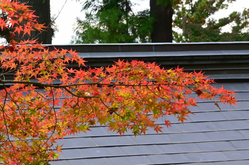 色付きはじめたモミジの鮮やかなグラデーションが屋根に映えます。