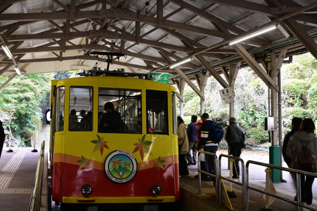 体力温存と時間節約で清滝駅からケーブルカーを使用します。運転時間は片道6分で一度に135人を運べるとの事です。日曜日でしたが一台待っただけで乗れました。通常15分間隔のところ今日は10分間隔での運転だそうです。